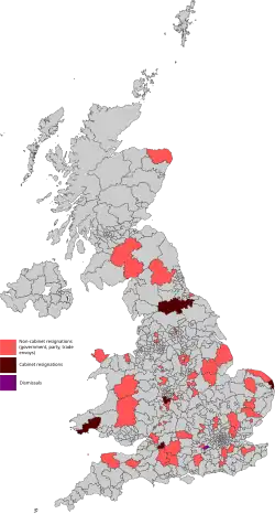 In early July 2022, 62 of the United Kingdom's 179 government ministers, parliamentary private secretaries, trade envoys, and party vice-chairmen resigned from their positions in the second administration formed by Boris Johnson as Prime Minister,[1] culminating in Johnson's resignation on 7 July.[2] Johnson's premiership had been considered in danger for months after several scandals, but it was the Chris Pincher scandal that was identified to have spurred on the resignations. Considered the "last straw" for the Prime Minister, the scandal arose after it was revealed that Johnson had promoted his Deputy Chief Government Whip Chris Pincher, who was publicly facing multiple allegations of sexual assault, to the position despite knowing of the allegations beforehand.[3][4]