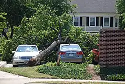 Damage was widespread and extensive along the entire path of the derecho, especially in northern Indiana and the Fort Wayne metro area, central and western Ohio, northeastern Kentucky, southwestern Pennsylvania, West Virginia, northern, central, and southwestern Virginia,[15] Maryland, Washington, D.C., Delaware and southern New Jersey. In all the mentioned areas, many trees uprooted or snapped, roofs became damaged, tents deployed to sell fireworks leading up to the 4th of July Holiday collapsed, and power outages were extensive, with over 4.2 million customers losing power as a result.[16] [17] An Appalachian Power representative described the power outage as the worst the company had ever seen.[15] In total, 22 people were killed across seven states and the District of Columbia.[18] At least ten of those deaths were in Virginia, all of them due to fallen trees.[15] Two of the deaths were in New Jersey, after two children were killed by falling trees at a campground at Parvin State Park, three deaths were reported in Maryland and one death was reported in Ohio after the storm.[19] As it occurred in the midst of the record Summer 2012 North American heat wave, conditions on following days were problematic, particularly for seniors and vulnerable people. Scattered structural damage also occurred along the path of the derecho, from both falling trees and the winds themselves. Some of the damage included siding was torn off houses, roofs removed from houses, businesses and apartment buildings, mobile homes heavily damaged, barns and garages destroyed and airplanes flipped.[7]