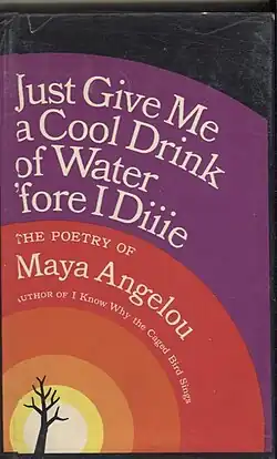 Just Give Me a Cool Drink of Water 'fore I Diiie (1971) is the first collection of poems by African-American writer and poet Maya Angelou. Many of the poems in Diiie were originally song lyrics, written during Angelou's career as a night club performer, and recorded on two albums before the publication of Angelou's first autobiography I Know Why the Caged Bird Sings (1969). Angelou considered herself a poet and a playwright, but is best known for her seven autobiographies. Early in her writing career she began a practice of alternating the publication of an autobiography and a volume of poetry. Although her poetry collections have been best-sellers, they have not received serious critical attention[1] and are more interesting when read aloud.[2]