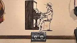 Bruno Mars arranging himself in a cassette tape in the shape of him playing the piano, in the music video.