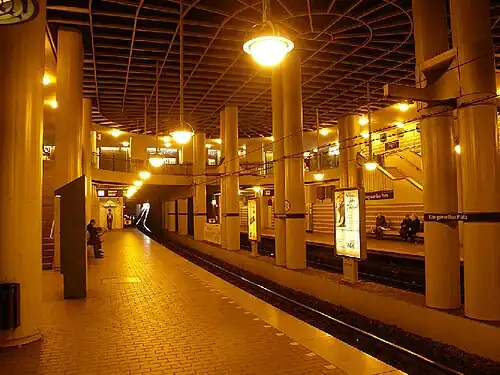 Königsworther Platz is a Hanover Stadtbahn station served by lines 4 and 5. Fairground line 16 also terminates here. This station consists of a mezzanine level and two side platforms.