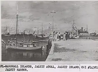 At some point in the service of Kōshū during the late 1920s or early 1930s, it likely visited Jaluit Harbor in Japan's South Seas Mandate for the Marshall Islands. A photograph of Jaluit Harbor shows a ship flying the Japanese flag in the background and Kōshū written on the ship, although several ships had this somewhere in its name. This would normally not be terribly interesting, but the identity of the ship in the photograph became a dispute after the airing of Amelia Earhart: The Lost Evidence, which claimed the ship was the Kōshū Maru, a military ship that had been sent to capture Amelia Earhart, and that the photograph had likely been taken in 1937 or 1938.[1] Japanese blogger Kota Yamano, who discredited a number of other claims the documentary made, said he believed the ship in the photograph to be the old survey ship Kōshū instead; other analysts believed that the photograph, based on other clues, likely was taken in the late 1920s or early 1930s.[2][3]