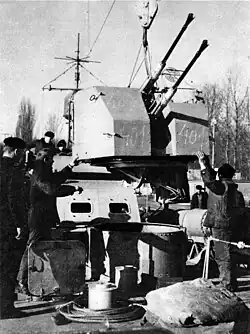 The vessel was equipped with two single TTKA-53M torpedo tubes (caliber 533 mm), mounted along the sides amidships with a 6° outward offset, carrying two torpedoes of the 53-38U or 53-39 type.[2][3] The vessel's artillery armament consisted of two twin 2M-3M autocannons (caliber 25 mm), with a total ammunition supply of 4,000 rounds, mounted in front of the superstructure (offset to the left of the vessel's longitudinal axis to improve visibility from the bridge) and on the stern.[1][5] Its anti-submarine warfare armament consisted of 8–12 BB-1 depth charges, located along the sides in the stern section, behind the torpedo tubes.[3][5] Optionally, instead of torpedoes and depth charges, the vessel could carry 18 AMD-500 naval mines.[2] The electronic equipment included the Tros fire control system, Kremnij-1 identification friend or foe system, R-609 radio communication station, and Zarnica radar.[1][2][4] The vessel was also equipped with stern-mounted launchers for 12 smoke candles.[7]