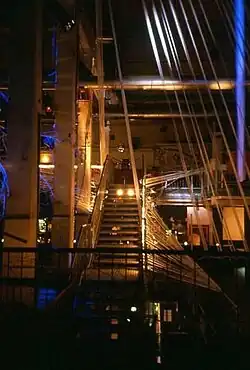 The club was located in a decommissioned cogeneration power plant of the food manufacturer Pfanni, and poured on the charm of an old industrial production site.[18] Thus it represents an early example of the reutilization of disused power plants and their robust industrial setting as techno clubs, an approach that was later followed by clubs such as Berlin's Berghain (2004), the second Tresor (2007), and Munich's MMA Club (2014).[6] The KW was subdivided into 3 levels: the main area with the main dancefloor, the upper level with the lounge area, and the basement. The hall-like main area was subdivided by several tall concrete columns and a large steel staircase, which led on to the upper level. The club housed several bars, and also had an outdoor chill-out area. Due to the geographical proximity to other popular clubs in Munich such as Ultraschall und Natraj Temple, the club had to deal with a phenomenon called club sharing.[9]