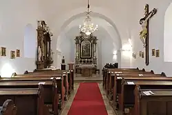 The central element of the church is the Baroque altar. He is flanked by statues of Saint Leopold and Saint Florian. The altarpiece shows a depiction of Saint George from 1827; it is the work of Nazarene painter Johann Stätter and was based on a sketch by Ludwig Ferdinand Schnorr von Carolsfeld. To the right of the altar, there is a late Gothic altar to Mary, which was erected in 1760. The depiction of the Madonna in the centre of the church dates from the early 16th century. There is a large, Baroque crucifix on the southern wall, which was originally part of an altar. The altar was placed on the northern external wall in 1732, but was removed in the 19th century. Further noteworthy elements of the church are a Gothic Baptismal font made of red marble (which dates to around 1500), an alms box decorated with rosettes, and a stoup (both date from the 17th century). The organ was made by Franz Ullmann in 1849.