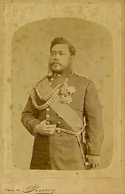 Kalākaua was a career politician who rose through the ranks of chiefs, and was named by Kamehameha III in 1844 as eligible to be king.[1] Kamehameha V, the last of the Kamehameha dynasty, died on December 12, 1872, without naming a successor to the throne. Under the 1864 Constitution of the Hawaiian Kingdom, if the king did not appoint a successor, a new king would be elected by the legislature to start a new royal line of succession.[2] Lunalilo became the first elected monarch of Hawaii, with Kalākaua holding the rank of Colonel on the royal military staff. Upon Lunalilo's death on February 3, 1874, a legislative election was held, with Kalākaua being sworn in as monarch on February 13.[3] Two weeks after taking office, he reorganized the Hawaiian military and restored the Household Guards recently abolished by Lunalilo.[4] Like his predecessors, he belonged to fraternal organizations, as a member of the freemasonry Lodge Le Progres de l'Oceanie,[5] and as the founding member of the Ancient Order of Foresters in Hawaii.[6]