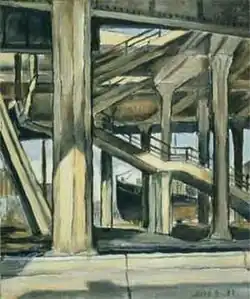 While his skill as a sign painter was a source of income, his oil paintings headed in a very different direction. He painted scenes of the world around him—houses, apartment buildings, stores, streets, bridges, the waterfront—using bold outlines and subtle valuation of earthen tones. With his friend Nomura and others he at times ventured into the countryside to paint rural scenes, but most of his still-extant paintings show urban scenes of the city where he lived and worked. Because of his vernacular subject matter and realist approach he came to be associated with the American Scene painters, but unlike many of them he rarely painted human forms.[8]