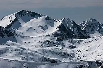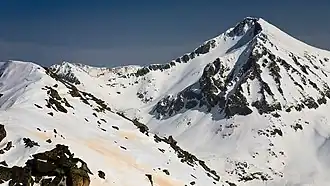 Kamenitsa (Bulgarian: Каменица [ˈkamɛnit͡sɐ]) is a peak in the Pirin mountain range, south-western Bulgaria. It is located in the northern part of Pirin on the 22 km-long Kamenitsa secondary ridge between the summits of Malka Kamenitsa to the north and Yalovarnika (2,763 m) to the south.[1] Its height is 2,822 m which ranks it on fifth place in Pirin, behind Vihren (2,914 m), Kutelo (2,908 m), Banski Suhodol (2,884 m) and Polezhan (2,851 m).[1][2] The peak is built up of granite blocks covered in lichens.[2]
