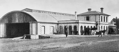 The station opened on 13 August 1860 when the railway line was opened from Gawler to serve the copper mining at Kapunda.[1] The line was later extended to Morgan on 23 September 1878[2] Kapunda railway station consisted of a large building built of bluestone brought from the Kapunda quarries. The facilities at the station were made in the anticipation for large amounts of traffic until the mining ceased in 1879.[3] The facilities consisted of a goods shed and railway station yards[4] The station building itself was a two-storey station consisting of a ticket office.[5] A barrel roofed building straddled along the station and the railway line but it was demolished.
