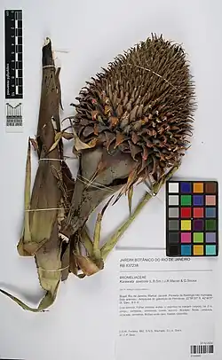 2. ^ Martinelli, Gustavo; Vieira, Cláudia Magalhães; Gonzalez, Marcos; Leitman, Paula; Piratininga, Andréa; Costa, Andrea Ferreira da; Forzza, Rafaela Campostrini (January 2008). "Bromeliaceae da Mata Atlântica Brasileira: lista de espécies, distribuição e conservação" [Bromeliaceae of the brazilian Atlantic Forest: checklist, distribution and conservation]. Rodriguésia (in Brazilian Portuguese). 59 (1): 209–258. doi:10.1590/2175-7860200859114. JSTOR 23499386.