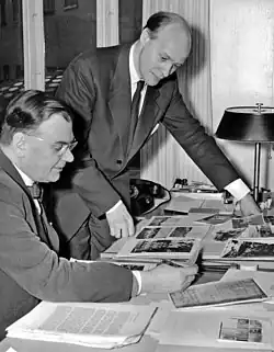 The director of the Riksbank's paper mill in Tumba and the artist Karl-Erik Forsberg at Nordstedts examine the pictures in the anniversary book.