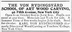 In 1905, Rydingsvärd taught wood carving at the Manchester Institute of Arts and Sciences in Manchester, New Hampshire,[38] as well as at the New York City YWCA.[39] In 1909, he taught at the Troy School of Arts and Crafts in Troy, New York.[40]