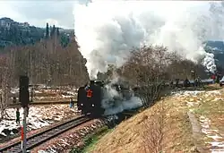 The Karlovy Vary–Johanngeorgenstadt railway connects Karlovy Vary in the Czech Republic with Johanngeorgenstadt in Saxony, Germany. The highest point of this mountain railway lies 915 metres (3,002 ft) above sea level. The entire line was opened for regular traffic in 1899.