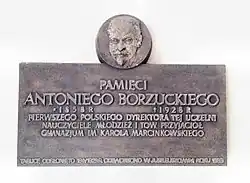 On 26 March 1925, a bust of the patron, created by the art teacher Aleksander Korpal, was solemnly unveiled in the building. On 18 April 1929, a commemorative plaque by the same author was unveiled, dedicated to the late first school principal, Antoni Borzucki, who passed away the previous year. It was dismantled and destroyed by the Germans during World War II.[8] As part of the school's 50th anniversary celebrations in 1969, a plaque by Irena Rosińska was unveiled in the main hall, commemorating the teachers and students who died and were murdered between 1939 and 1945. On the occasion of the 70th anniversary, the reconstructed memorial plaque in honor of Antoni Borzucki was also unveiled there.[4][12]