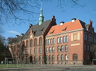 The school complex occupies a plot of land measuring 1,200 m2 in the triangle formed by Bukowska, Grunwaldzka, and Szylinga streets, adjacent to the Poznań Old Zoo. The main two-story neo-Gothic building, made of red brick, has two lower annexes at the side elevations. Initially, one of these annexes (southern) served as the principal's residence, while the other (northern) was designated for the caretaker's house. The interior layout is semi-bay, with classrooms located on the side facing the soccer field. The hall on the ground floor, covered with neo-Gothic lierne vault, is flanked by two spacious staircases leading to the auditorium. The original restrooms were located in a separate, longitudinal building on the west side of the main building, connected to it by two arcaded skyways. In later years, a sewage pipe was added to the main building. In the northeast corner of the plot, a separate building housing the gymnasium was located, with a botanical garden attached to it from the south. The central part of the plot was occupied by a gravel soccer field. The area south of the school building and the one adjacent to the main entrance were landscaped into small green spaces.[5][6][7]