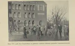 In 1938, the last eight-year cycle high school graduated in took place. In the following year, the final exams were already held in a six-year cycle (four-year gymnasium and two-year high school, culminating in small and large exams, respectively). In the 1937/1938 school year, there were 480 students attending the school. The outbreak of World War II caused a break in its operations. As a result of wartime activities and repression by the occupiers, 14 pre-war teachers and 119 students (including 10 graduates of the German gymnasium) perished.[4][3] During the war, the building premises initially served as German military barracks, then as a military hospital, and from February 1945 as a Red Army hospital.[5][7]