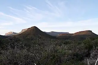 About 60 million years after the Beaufort sediments had been laid down and topped with a thick layer of desert sands, there was an outpouring of lava on to Southern Africa on a titanic scale. The entire area was covered within a very short space of time with a 1.5 km thick layer of lava, the remnants of which form the Drakensberg. In addition to flooding the African surface with lava, lava was also forced under great pressure between the sedimentary layers of the Beaufort rocks. These subterranean horizontal layers of lava solidified into what are known as dolerite sills, which can vary in thickness from a few centimetres to several meters.[15][16] Subsequent erosion of the Southern African interior re-exposed the Beaufort rocks over most of the Great Karoo. But the dolerite sills were more resistant to erosion than the Beaufort sediments, which resulted in the creation of flat topped hills all over the Karoo (the flat tops being formed by dolerite sills). The flat top edge of the Great Escarpment in the Karoo is also formed, in many places including the Karoo National Park, by a thick dolerite sill.