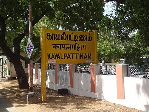 Kayalpattinam railway station is a station in Kayalpattinam, Thoothukudi district, in the state of Tamil Nadu, India. It belongs to the Madurai railway division.[1] The Tirunelveli – Tiruchendhur railway line[2] was laid and inaugurated by the British Indian government in 1923 mainly for raw materials export, This region is famous for salt production, in early days salt and sugar were major exports through this route. The 70 km meter gauge line was closed 2006 for gauge conversion and the broad gauge line was inaugurated in 2009. This section was electrified on 2022.