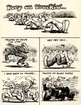 Keep On Truckin' is a one-page cartoon by Robert Crumb, published in the first issue of Zap Comix in 1968. A visual burlesque of the lyrics of the Blind Boy Fuller song "Truckin' My Blues Away", it consists of an assortment of men, drawn in Crumb's distinctive style, strutting across various landscapes. The cartoon's images were imitated and much displayed during the hippie era.