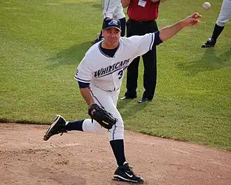 Rogers warming up prior to a rehab start with the West Michigan Whitecaps, Single-A affiliates of the Detroit Tigers in 2007.