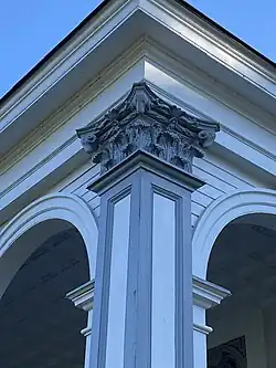 By the early 1850s, Matthew hired Edward Culliatt Jones (1822–1902) and Francis D. Lee (1826–1885) of Charleston to design Kensington Mansion using architectural elements from the Louvre and Palace of Fontainebleau in France as inspiration. Between 1851 and 1854, many skilled laborers enslaved by the Singletons planed the cypress and pine lumber, shaped the bricks, mixed the plaster, and forged the ironwork used in the mansion's construction.[17][18] Predating the emergence of the Second Empire style in the 1870s, the resulting three-story structure, completed in 1853, consists of a cruciform floorplan, 29 rooms, and12,000 square feet. Built on a raised brick basement, the house is made of wood and capped with a domed copper roof. The exterior includes a three-part porte-cochere with modified Corinthian arches and pilasters that feature goat heads. Inside, intricate plasterwork and cast-iron railings culminate in a glass sky light in the domed ceiling.[19][20][21]