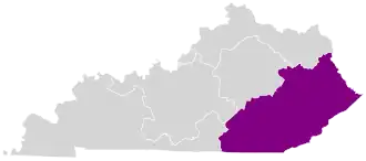 The district contains the counties of Bell, Boyd, Breathitt, Clay, Elliott, Floyd, Harlan, Jackson, Johnson, Knott, Knox, Laurel, Lawrence, Lee, Lincoln, Leslie, Letcher, Magoffin, Martin, McCreary, Menifee, Morgan, Owsley, Perry, Pike, Pulaski, Rockcastle, Rowan, Wayne, Whitley, Wolfe, and parts of Bath, and Carter counties.[6] Within the district are the economic leading cities of Ashland, Pikeville, Prestonsburg, Middlesboro, Hazard, Jackson, Morehead, London, and Somerset. It is the most rural district in the United States, with 76.49% of its population in rural areas.[7]
