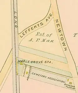 In order to better serve Maple Grove Cemetery, a new station was opened at Maple Grove, near the cemetery's western entrance. This station opened in May 1879.[24][25] The station was a flag stop, with trains only stopping upon request.[26] Funeral trains also served the station, and received special rates.[27] It had low-level platforms located to the rear of where the Mowbray and Kew Gardens Plaza Apartments are located today.[26] The eastbound platform had a station building which was designed by James Ware.[28]: 59  To the west of the station, there was a grade crossing with Lefferts Avenue (now Lefferts Boulevard).[29] In summer 1879, a new depot was installed at the station, which opened up to a new western entrance to the cemetery.[30]