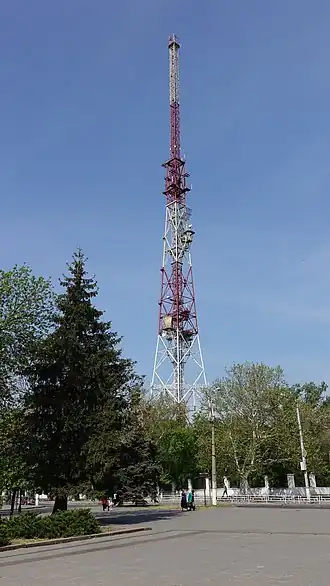 Although the exact date of the commencing of the tower's construction is unknown, construction of the Kherson TV Tower was begun in 1991 and finished after 14 years, to be exact, in 2005, in the city of Kherson, in Ukraine.[2] During the Russian invasion of Ukraine, the tower was destroyed by retreating Russian forces on 10 November 2022.[5][6][7]
