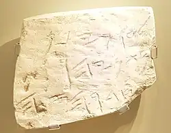 One thousand seven hundred ostraca in Aramaic may have been found on the site and the vicinity, dating from the Persian and Hellenistic periods, during which the area was classified as the Persian province of Idumea, with a mixed population of Edomites, Jews and Arabs.[1] The site is called Maqqedah in the Idumean ostraca.[16] Based on this, some scholars identify Khirbet el-Qom with biblical Makkedah (Joshua 10:10, 16, 17, 21, 28, 29; 12:16; 15:41).[17]