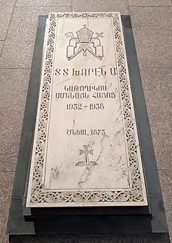 His body remained at the residence for two days until he was buried at the cemetery of the nearby Saint Gayane Church by several nuns of Etchmiadzin. His remains were reburied near the entrance of the same church by locum tenens Gevorg Chorekchian in 1941 with a gravestone.[32] On September 7, 1996, the remains of Khoren I were reburied by Catholicos Karekin I near the entrance of Etchmiadzin Cathedral, next to other Catholicoi of the Armenian Church.[38]