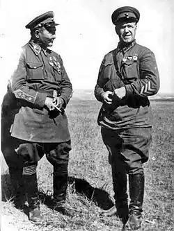 While he often gravitated towards the leftist faction of the party, he was suspected of being a rightist in what little mention is made of him in Soviet and Mongolian reports of the era.[15] Choibalsan himself did not include many of his own speeches from this period in his collected works, indicating his role during this period was not a prominent one. It was not until members of the Soviet security apparatus such as Soviet Commissar for Defense Kliment Voroshilov took note of Choibalsan's political usefulness in the late 1920s and early 1930s that his career prospects began to improve.[16]