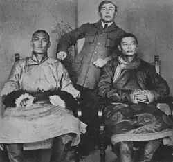 Named Dugar at birth, he assumed the religious name Choibalsan at age 13 after entering the local Buddhist monastery of San Beysiyn Khüree,[4] where he trained to be a Lamaist monk. Five years later he and another novice fled to Khüree (also known as Urga—present-day Ulaanbaatar), where he worked odd jobs. In part to prevent him from being returned to the monastery, a sympathetic Buryat teacher named Nikolai Danchinov had him enrolled in the Russian consulate's Russian-Mongolian Translators' School.[5] A year later he was sent on, at public expense, to study at a gymnasium in Irkutsk, Russia from 1914 to 1917.