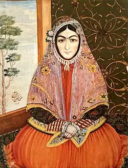 Khorshid Khanum Ghaffari (Persian: خورشید خانم غفاری) was a member of the Ghaffari family, who is notable for being depicted on a watercolor painting by her first cousin once removed Sani ol-Molk. She was the daughter of Mirza Ahmad Ghaffari and the aunt of Farrokh Khan.[1] Before photography and lithography became available in Qajar Iran, only a small number of portraits of known women existed. Some of these portraits were likely created just after lithography became available, during the rule of Mohammad Shah Qajar (r. 1834–1848).[2] Khorshid Khanum's portrait, dated 1834 or 1835,[1] was made just before the introduction of photography and lithography to the country. Other notable women depicted on portraits during this period include Zia ol-Saltaneh and Malek Jahan Khanum Quvanlu. Including women in paintings may have been a part of the increasing popularity of portraits in general during the early years of Mohammad Shah's rule.[3]