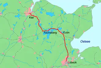 The route runs from Kiel via the towns of Preetz, Plön and Eutin to Lübeck through the Schleswig-Holstein Uplands and, on the AschebergEutin section, through Holstein Switzerland. This region is characterized by lakes, forests and terminal moraines and is thus an important recreational area.