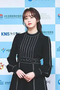 Kim has been dubbed by several Korean media outlets as "Nation's Little Sister", "Queen of Child Actresses", as well as "Goddess of Sageuk" after starring and appearing in various acclaimed historical period dramas throughout her career.[3][4] She has also been called the "Nation's First Love" from her performance in the film Pure Love (2016),[5][6][7][8] and has established herself as a next generation hallyu star.[9][10] For her performance in River Where the Moon Rises, she was nominated for Baeksang Arts Award for Best Actress – Television, becoming one of the youngest nominees for the award.[11]