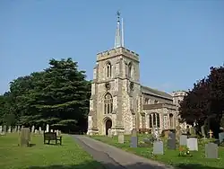 Kimpton's parish church, dedicated to St Peter and St Paul, dates back to circa 1200. It is a spacious flint-built building in the unusual transitional style between Norman and Early English.[4] The Dacre Chapel has a fine Perpendicular screen, and the remains of early wall paintings in the chancel show St Christopher and the Seven Corporal Works of Mercy. The belfry contains a peal of eight bells, the oldest having been cast c. 1390.