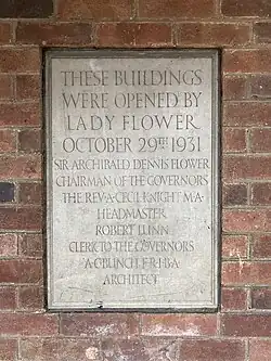 A stone plaque detailing the opening of classrooms in the school's quad