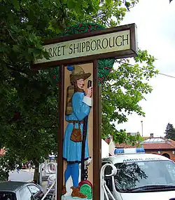 The Swaffham town sign, depicting the Pedlar of Swaffham, is altered to show "the Tinker of Market Shipborough". The filming of Kingdom in Swaffham has had a positive effect on the local economy.