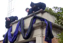 Firefighters laying bunting above the Kirkwood Police Department entrance as a memorial on February 8