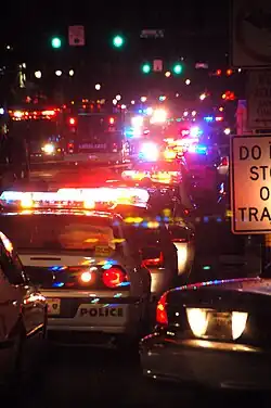 All of this gunfire was audible at the Kirkwood police department building, located across a small parking lot from the rear entrance to city hall. Two Kirkwood police officers rushed to the council chambers. There, Thornton fired on them from behind a desk. The officers returned fire; Thornton, who still had rounds left, sustained two gunshot wounds to the neck and abdomen and died at the scene.[7][10][11]