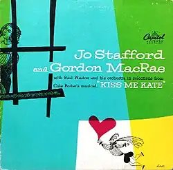 Selections from "Kiss Me, Kate",[1] or simply "Kiss Me, Kate, is a 1949 album of songs from the musical of the same name recorded by American singer Jo Stafford and actor and singer Gordon MacRae.[3] It was released in April 1949 on Capitol Records.[4][5] In its record review column, Saturday Review called it the best album of the show's songs outside the original cast album.[6]