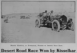 The Kissel marque experienced some sporting success, with Harvey Herrick winning the 1910 Los Angeles to Phoenix "Cactus Derby" road race behind the wheel of a "KisselKar." The most famous Kissel was one the company donated to Hollywood actress Anita King for her transcontinental trip in 1915 that marked the first-ever such trip by a female driving alone. The most popular Kissel model was the 1919 thru 1927 Speedster, nicknamed the Gold Bug. The two passenger (sometimes four-passenger) Gold Bug was owned by famous personalities of the time such as actor Roscoe Arbuckle and aviator Amelia Earhart.[6] Beginning in 1927, Kissel also produced the sporty White Eagle Speedster.[7]