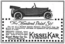 The Kissel Motor Car Company was an American automobile and truck manufacturer founded by Louis Kissel and his sons, in Hartford, Wisconsin. The company custom built high-quality automobiles, hearses, fire trucks, taxicabs, and trucks at their plant on 123 Kissel Avenue in Hartford.[1]