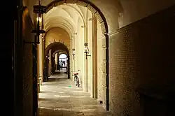 Klostergården is part of a large block which is bounded by Højbro Plads to the east and Hyskenstræde to the west. The façade on Amagertorv is 10 bays long and has a four-bay central projection. A frieze with lettering between the first and second floor reads Monumentum Pietatis Petersenianae ("Memorial to the piousness of Petersen"). A gate to the right of the main entrance opens to a passageway, Klostergangen, which continues through three small courtyards before reaching Læderstræde on the other side of the block. It dates from Helveg-Møller's renovation in 1918.[4]