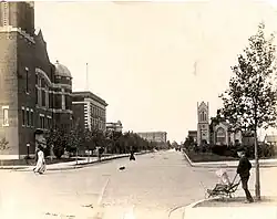Metropolitan Methodist and Knox Presbyterian on Lorne Street, both facing Victoria Park, Regina 1911 before their destruction by the "Regina Cyclone" in 1912.