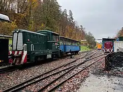 There are currently two steam locomotives U 36.003 Katka and U 29.101 Krutwig and four diesel locomotives TU 29.2002 Janka, TU 29.2003 Danka, TU 29.2004 Vlasta and TU 29.2005 Anička. The steam locomotive U 36.003 Katka has been in operation on the children's railway since 1991. It is the oldest functioning steam locomotive in the territory of the former Czechoslovakia. It was built in 1884 for the narrow gauge line from Gelnica via Mníšek nad Hnilcom to Smolník, where it operated until its abolition in 1965, with the exception of the period from 1938 to 1949, when she was running on the Hronská Breznica - Banská Štiavnica route. Since 1974 it was exhibited on a plinth in Spišská Nová Ves. In 1990 it was transported to České Velenice, where it was reconstructed to work on the children's railway.[1] p. 32-33 However the locomotive experienced frequent malfunctions in the 1990s. For example, in 1997 the boiler had to be transported again to České Velenice due to the poor technical condition. In 1999, on the occasion of the 50th anniversary of the Children's Railway, it was exhibited at the Banská Štiavnica railway station.[9] A similar U 36.0 class locomotive (U 36.004) was used in 1955-1956 on the railway.