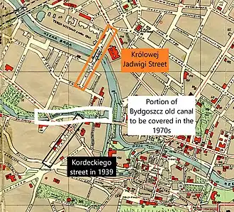 In 1974–1975, after the filling of a portion of Old Bydgoszcz Canal,[3] Kordeckiego street gained connection with Królowej Jadwigi Street at the crossing with Focha street in the north.
