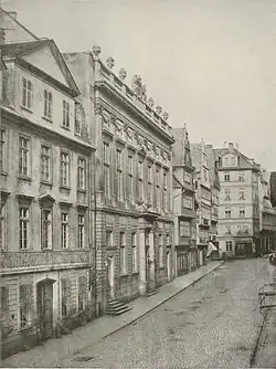 The neighboring house Liebeneck (Großer Kornmarkt 15) was occupied by the Schönemann banking family, whose daughter Lili engaged with Johann Wolfgang Goethe in 1775, who grew up a few streets away. On Große Sandgasse, a street branching off from Kornmarkt, stood the house Zum Goldenen Kopf, since 1777 the residence of the Brentano family, Bettina's birthplace, and the house where her mother Maximiliane passed away. In the neighboring house was the Naumann'sche Druckerei, responsible for producing the stamps for the Thurn and Taxis Post Office.[9]