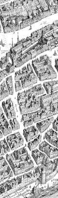 In the Middle Ages, the southern part of Kornmarkt was primarily occupied by armorers and blacksmiths. However, towards the end of the 15th century, the area underwent a significant transformation as printers and booksellers started to settle here, displacing the previously resident crafts. This influx of new inhabitants led to the southern part of Kornmarkt being renamed Buchgasse. The merchants held a book fair here twice a year from 1480.[2] Over time, the Frankfurt Book Fair became the most important book fair in Europe. Due to the liberal regulations of the Free Imperial City, even the writings of Martin Luther could be traded here at the beginning of the Reformation, which was banned elsewhere because of heresy.[3] At the 1520 fair, a Frankfurt bookseller sold over 1400 copies of his writings. Luther himself stayed at the Gasthof Zum Strauß on his journey to the Diet of Worms on Sunday, April 14, 1521, and on his return on Saturday, April 27, 1521.[4][5] The Gasthof zum Strauß was located at the corner of Schüppengasse and Buchgasse; it was demolished in 1896 when Bethmannstrasse was built.