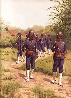 The Korps Marechaussee te voet, also known as Korps Marechaussee van Atjeh en Onderhoorigheden, was an elite gendarmerie unit of the Royal Netherlands East Indies Army (KNIL).[2][3] While initially used for securing and guarding fortifications during the Aceh War, it later focused on counter-insurgency in the Dutch East Indies.[4]